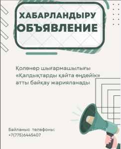 1. Қолөнер шығармашылығы «Қалдықтарды қайта өңдейік» өнеркәсіптік және тұрмыстық қалдықтардан жасалған бұйымдар (конкурстық жұмыстар қалдық материалдары мен қоқыстардан, (пластикалық шөлмектер, қаптар, банкалар, картон қораптар және т.б.) дайындалуы тиіс). Орындау техникасы еркін.
