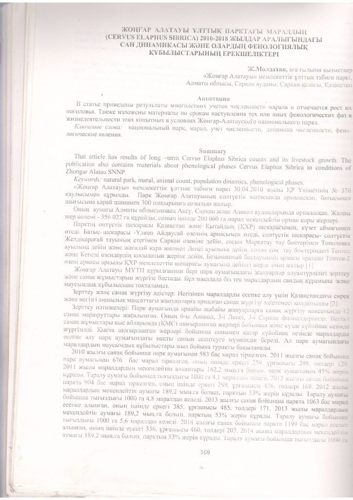 Жоңғар - Алатауы ұлттық паркіндегі 2010-2018 жылдардағы маралдар санының динамикасы және олардың фенологиялық құбылыстарының ерекшеліктері (2019 ж.)