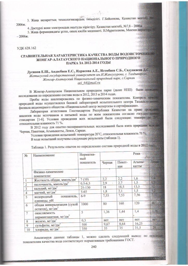 Жоңғар - Алатауы ұлттық табиғи паркінің 2012 - 2014 жылдардағы су көздерінің су сапасының салыстырмалы сипаттамасы (2014 ж.)