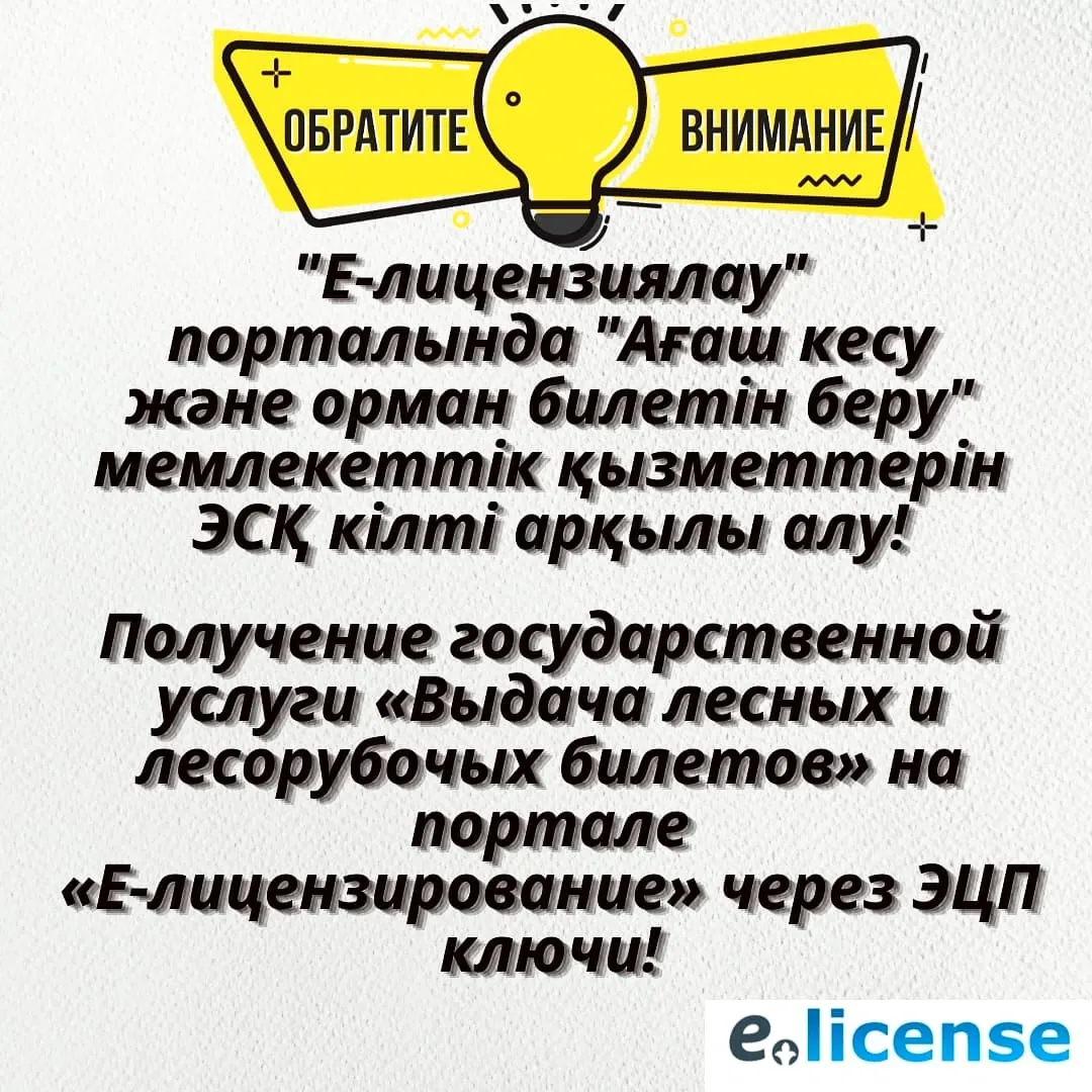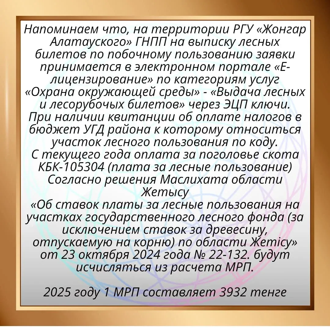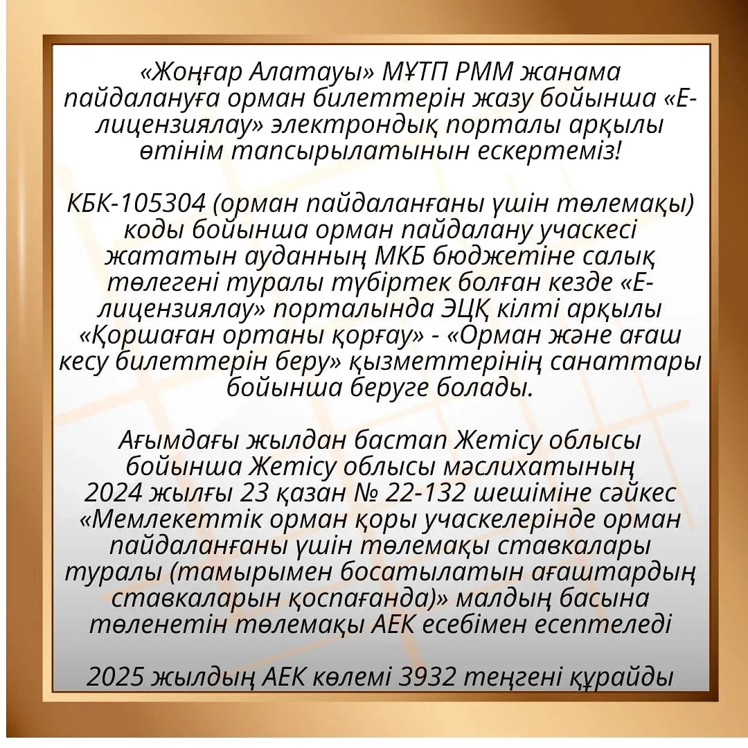 «Жоңғар Алатауы» МҰТП РММ жанама пайдалануға орман билеттерін жазу бойынша «Е-лицензиялау» электрондық порталы арқылы өтінім тапсырылатынын ескертеміз!