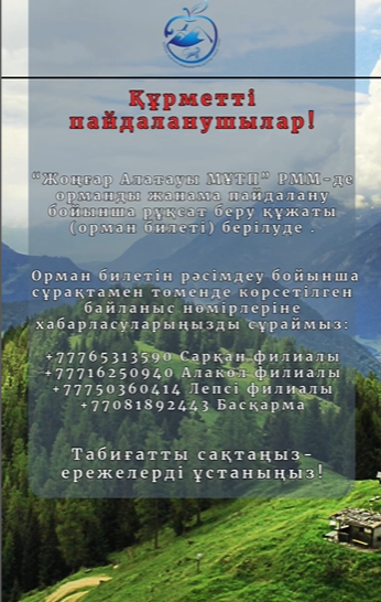 Орман билетін рәсімдеу бойынша сұрақтамен төменде көрсетілген байланыс нөмірлеріне хабарласуларыңызды сұраймыз: