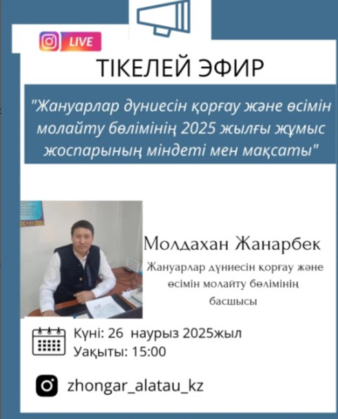 2025 жылғы 26 наурыз, сағат 15:00-де біздің Instagram парақшамызда "Жануарлар дүниесін қорғау және өсімін молайту бөлімінің 2025 жылғы жұмыс жоспарының міндеті мен мақсаты" тақырыбында тікелей эфир өтеді.