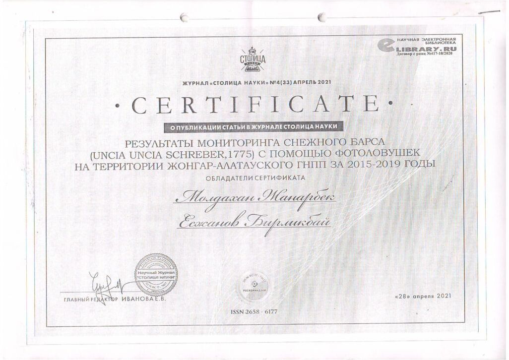 С помощью фотоловушек на территории Жонгар - Алатауского ГНПП за 2015 - 2019 годы (2021 г.)